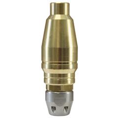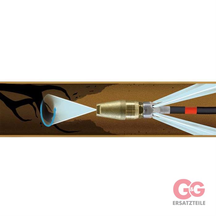Durch die 6 kraftvollen, nach hinten gerichteten Schubstrahlen wird die Düse bis zur verstopften Stelle geführt, wo der nach vorne gerichtete konusförmig rotierende Punktstrahl genügend Reinigungskraft liefert, um sich durch Wurzeln oder Ablagerungen hindurch zu fräsen.